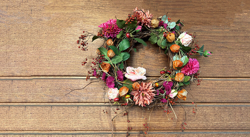 In deze DIY maken we een krans met zijden bloemen, aangevuld met verse takken zoals bessentakken, groen en Physalis-takken die mooi indrogen en ook langdurig houdbaar zijn. Volg de onderstaande stappen om je eigen bloemenkrans met kunstbloemen te maken!