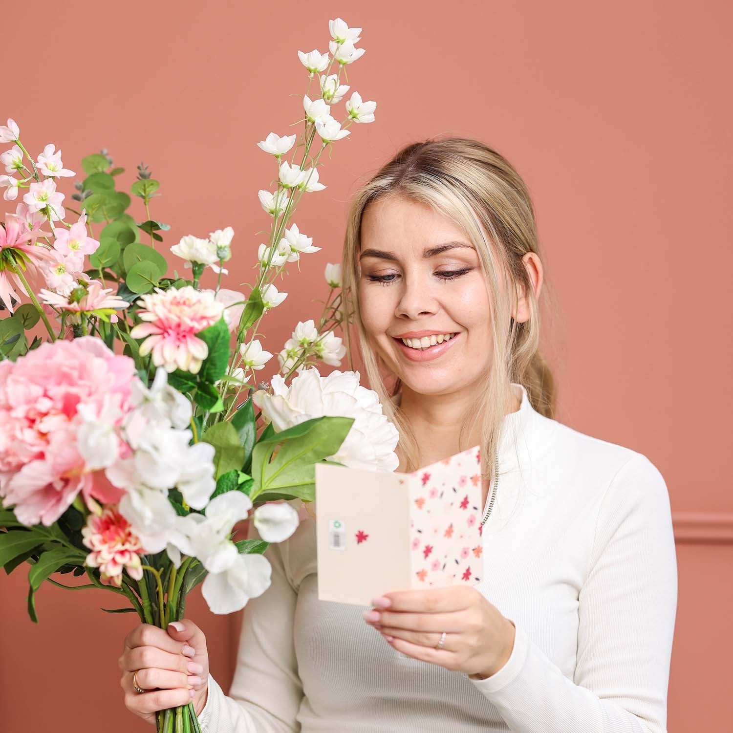 Wenskaartje met diverse bloemenpatronen is een stijlvol en compact kaartje met een zachte, natuurlijke uitstraling. De speelse bloemenprints geven elk kaartje een unieke en frisse look. Wij selecteren met zorg een passend design voor je. Met een afmeting van 12,5 x 8 cm is het kaartje ideaal om toe te voegen aan een cadeau, boeket of bestelling voor een persoonlijke touch.