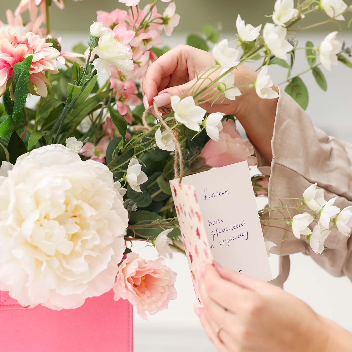 Wil je het kaartje laten voorzien van een persoonlijke boodschap? Geef dan in het opmerkingenveld duidelijk aan welke tekst je op het wenskaartje wilt laten plaatsen. Zo maken wij jouw bestelling helemaal compleet en klaar om te geven.