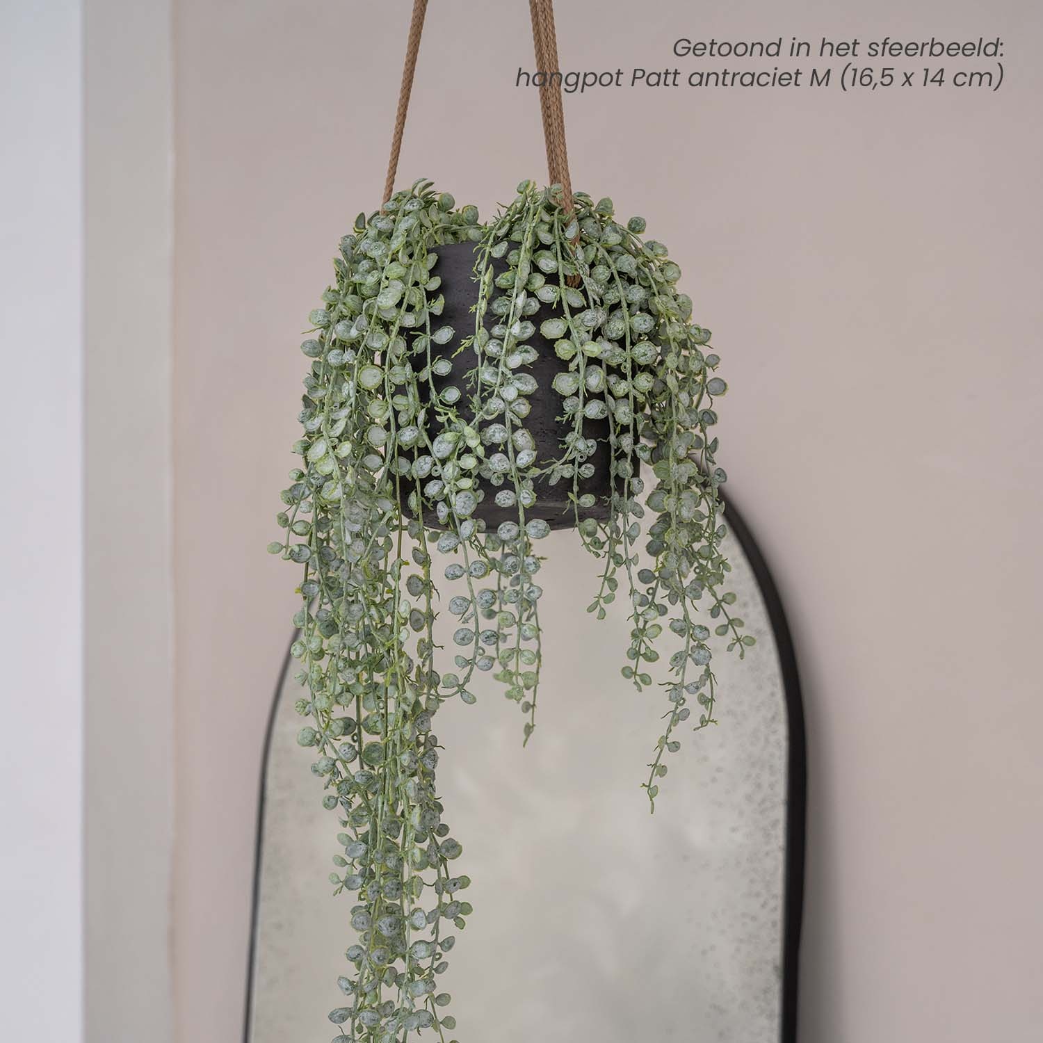 Hangpot Patt in de kleur antraciet is een plantenpot gemaakt van fiberclay, een mengsel van cement versterkt met glasvezels. De pot wordt opgehangen middels het meegeleverde touw inclusief ring en is in hoogte verstelbaar doordat het touw eenvoudig los te knopen is. Door het strakke design en de natuurlijke afwerking heeft de hangpot een moderne en stoere uitstraling. Doordat deze potten vervaardigd zijn uit fiberclay, zijn ze bijzonder sterk en toch relatief licht van gewicht. De potten kunnen zowel binnen als buiten opgehangen worden en zijn uv- en vorstbestendig.