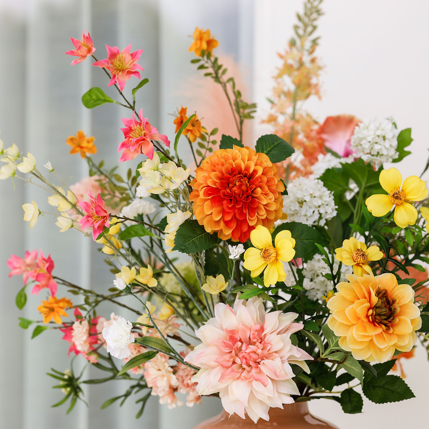 Ben jij op zoek naar een duurzaam alternatief voor gewone bloemen, waarbij de gedetailleerde structuur zo goed mogelijk benaderd wordt? Dan zijn de kunststelen van FloraWorks perfect voor jou! Wij selecteren onze zijden bloemen namelijk op basis van kwaliteit en uitstraling. Deze Dahlia kunststeel heeft een oranje bloem en kan zowel als los item of in een zijden boeket gebruikt worden. Voor het samenstellen van een mooi kunstboeket hebben we de volgende tips & tricks. Ben je daarnaast nog op zoek naar een bijpassende vaas voor jouw kunstbloemen? Neem dan een kijkje in onze collectie vazen.
