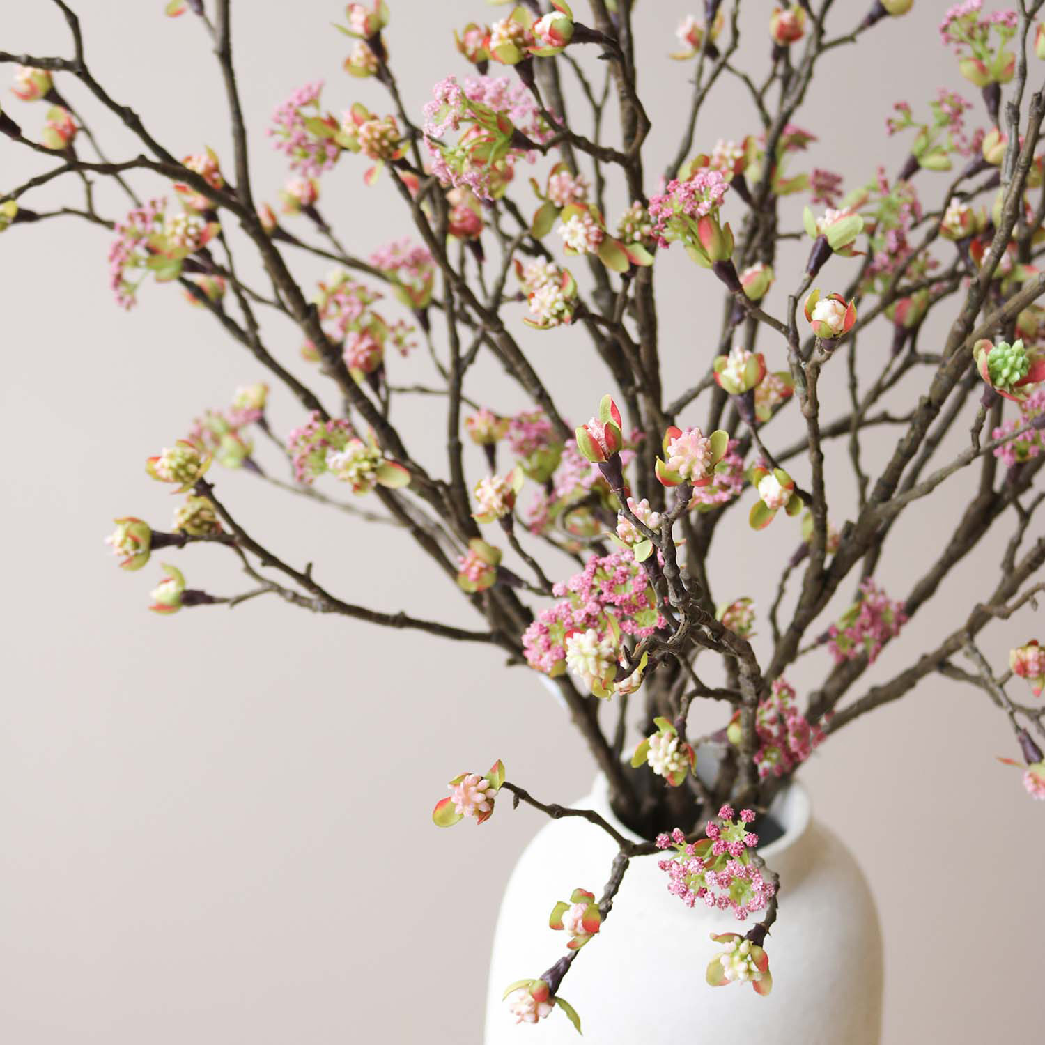 Kunstboeket Amber Sienna is een luchtig lenteboeket van roze Esdoorn kunsttakken. De kleine, frisse bloemknoppen en lichte groentinten roepen meteen het gevoel van het voorjaar op. Door haar eenvoud past dit boeket perfect in interieurs met een Japandi of Scandinavische stijl.