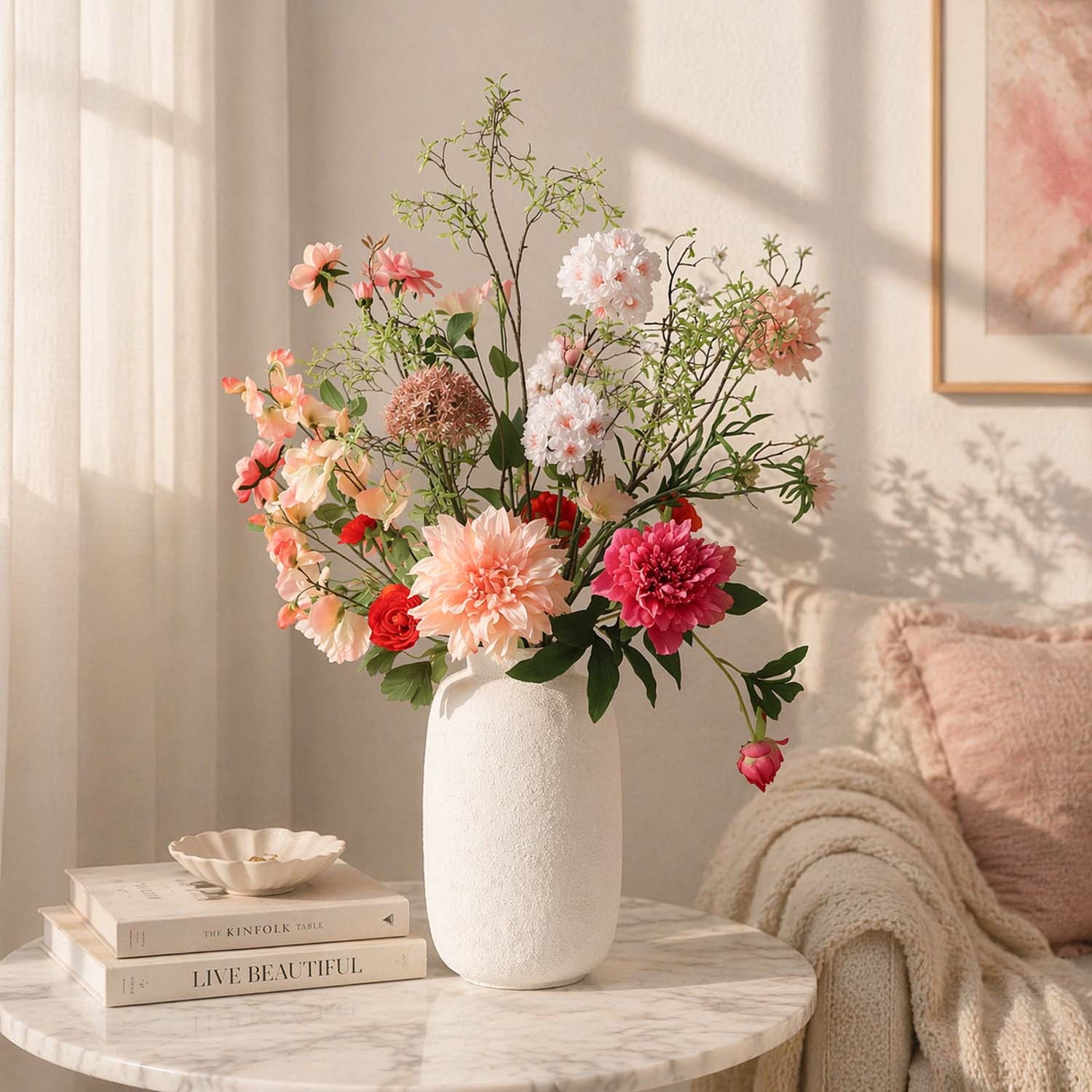 Zijden bloemen boeket Suri Lennon is een luchtig en trendy boeket van kunstbloemen in roze, witte, oranje en paarse tinten. De verfijnde combinatie van zachte pastelkleuren en frisse kleuraccenten zorgt voor een speelse en moderne uitstraling. Vertakte bloeiers zoals Lathyrus en Bloesem worden gecombineerd met volle bloemen zoals een Dahlia en een Allium, wat het boeket een natuurlijk en dynamisch karakter geeft. De open structuur en hoogteverschillen geven het geheel een elegante, bijna veldachtige uitstraling. Het boeket zit boordevol natuurgetrouwe kunstbloemen van hoogwaardige kwaliteit en brengt direct een frisse en stijlvolle sfeer in huis. Ideaal voor de aankleding van een woonkamer, keuken of entree.