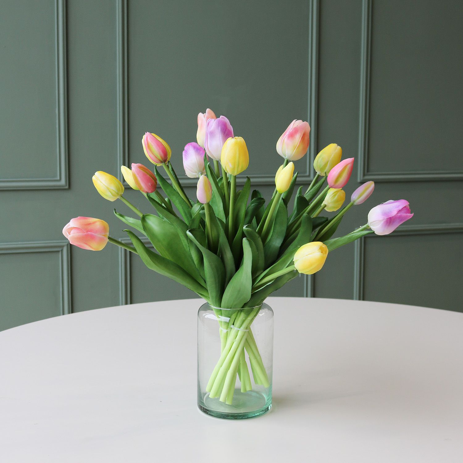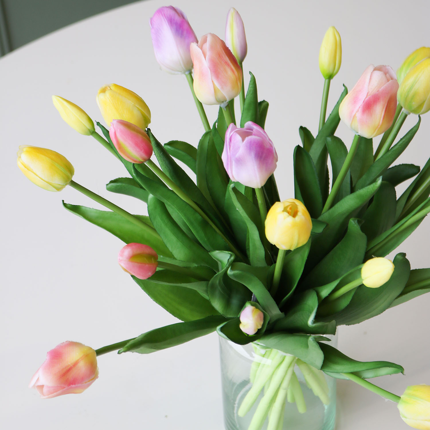 Kunstboeket Tulip Nova is een klein en kleurrijk boeket van Tulpen in gele, roze en paarse tinten. De bloemen en het blad zijn met oog voor detail vormgegeven en hebben een natuurlijke uitstraling, waardoor ze nauwelijks van echte tulpen te onderscheiden zijn. Dankzij de compacte hoogte is dit boeket perfect voor op tafel, een dressoir, vensterbank of in een open kast. Breng nu het frisse gevoel van het voorjaar in huis met dit elegante tulpenboeket.