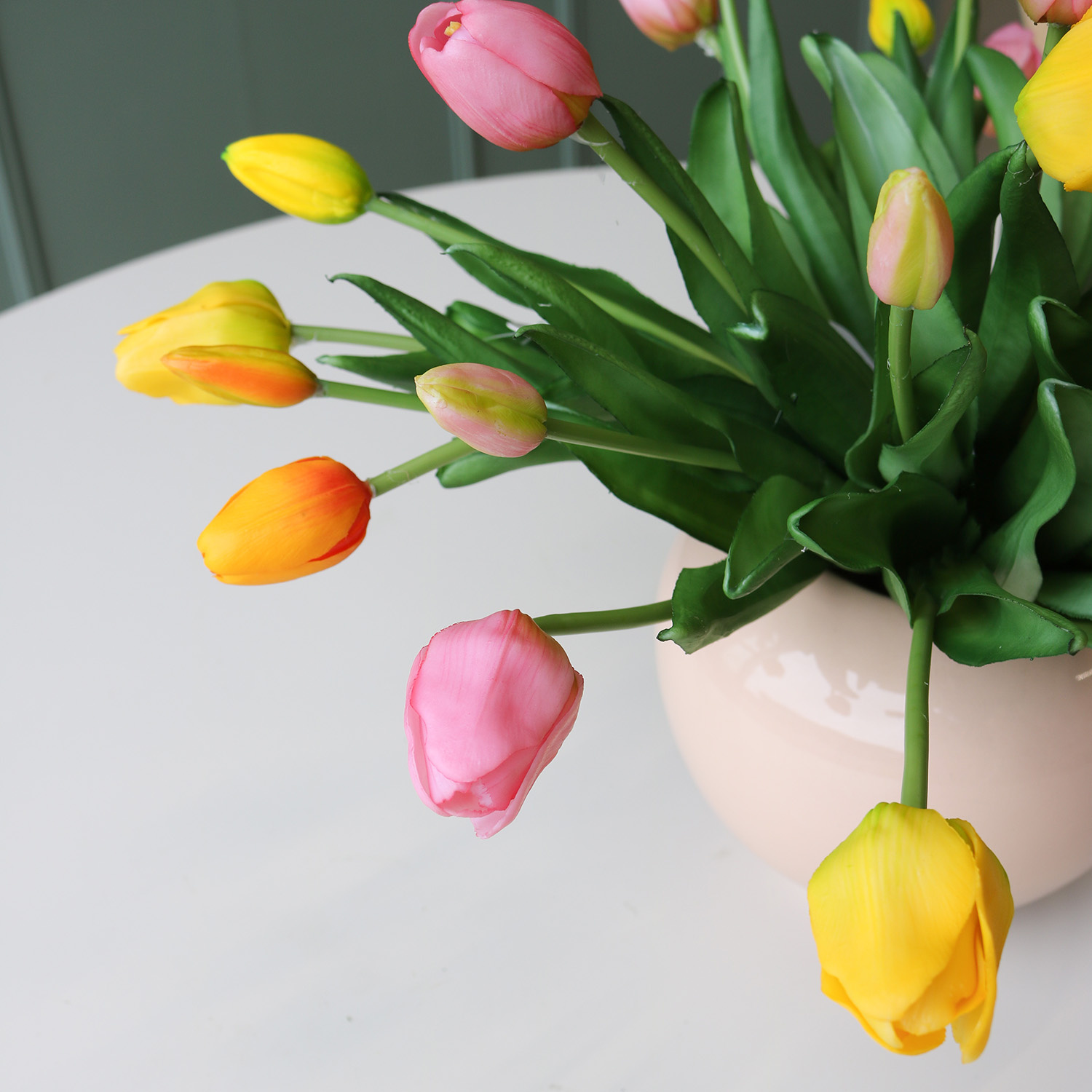 Kunstboeket Tulip Sol is een klein en kleurrijk boeket van Tulpen in roze, gele en oranje tinten. De bloemen en het blad zijn met oog voor detail vormgegeven en hebben een natuurlijke uitstraling, waardoor ze nauwelijks van echte tulpen te onderscheiden zijn. Dankzij de compacte hoogte is dit boeket perfect voor op tafel, een dressoir, vensterbank of in een open kast. Breng nu het frisse gevoel van het voorjaar in huis met dit elegante tulpenboeket.