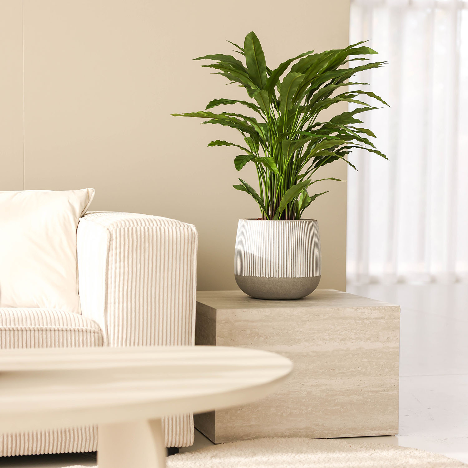 Deze kunstplant wordt geleverd inclusief een plastic binnenpot. We adviseren om de kunstplant in één van de buitenpotten te plaatsen, welke wij speciaal voor deze kunstplant als bijpassend product hebben geselecteerd. Uiteraard is het ook mogelijk om onze gehele collectie potten te bekijken. Voor een stevige bevestiging kan gebruik worden gemaakt van een piepschuim mal, maar ook gewone aarde volstaat.