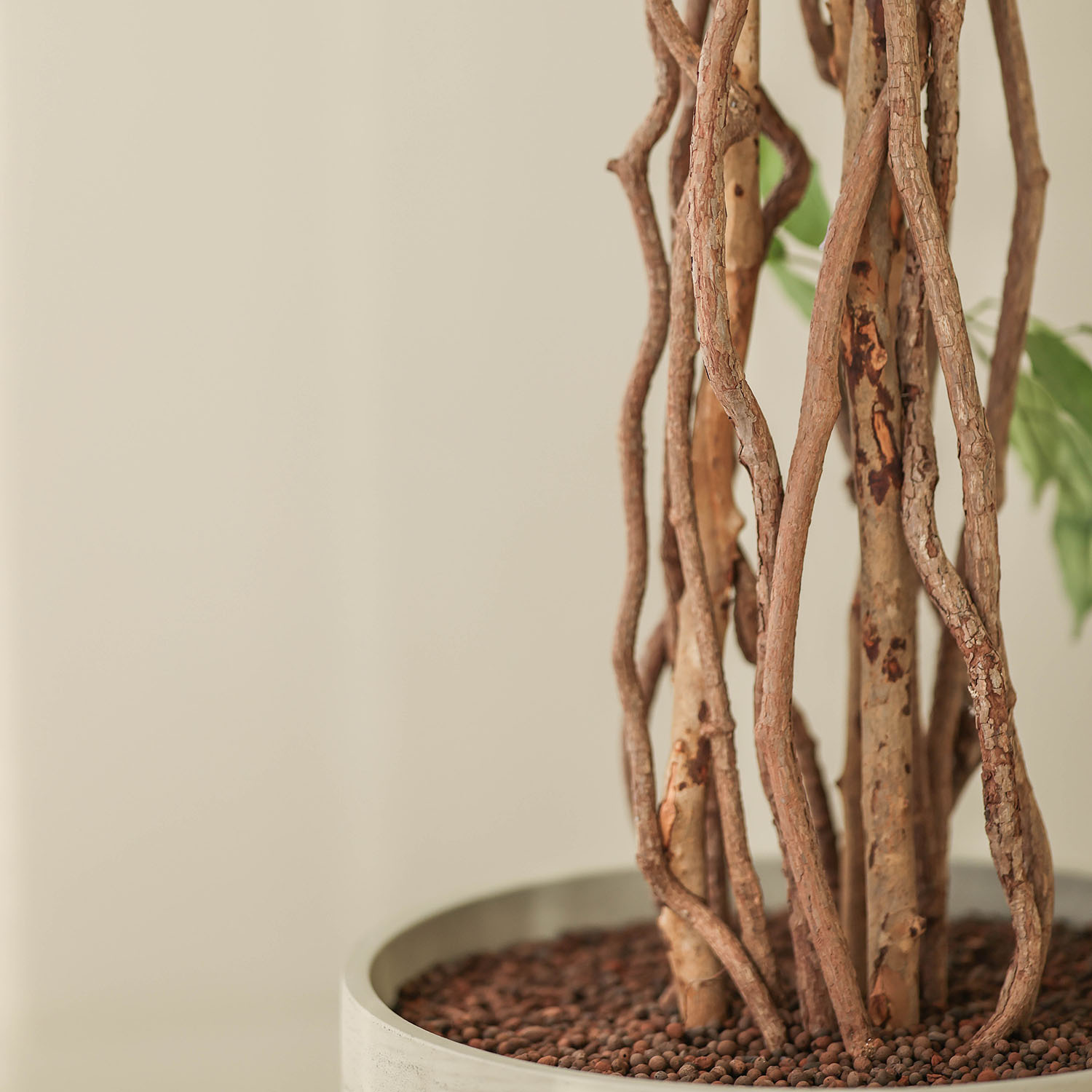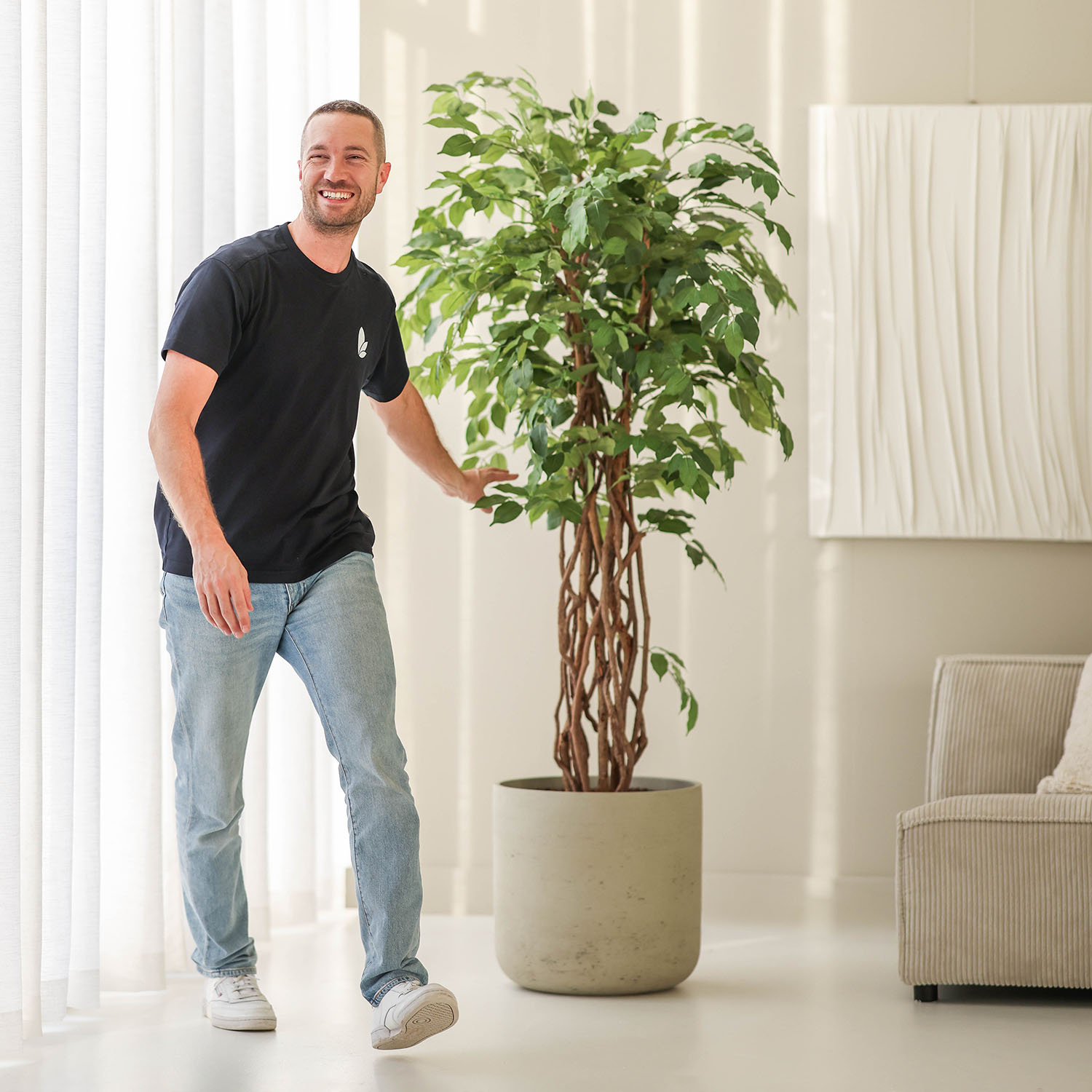 Ben jij op zoek naar een duurzaam alternatief voor gewone planten, waarbij de gedetailleerde structuur zo goed mogelijk benaderd wordt? Dan zijn de kunstplanten van FloraWorks perfect voor jou! Wij selecteren onze kunstplanten namelijk op basis van kwaliteit en uitstraling. Deze Ficus Liana kunstplant heeft een organische vorm met kronkelende stammen van echt hout en de combinatie met het volle bladerdek geeft deze plant een natuurlijke en speelse uitstraling. Ideaal voor wie op zoek is naar een mooie kamerplant, maar zonder onderhoud.