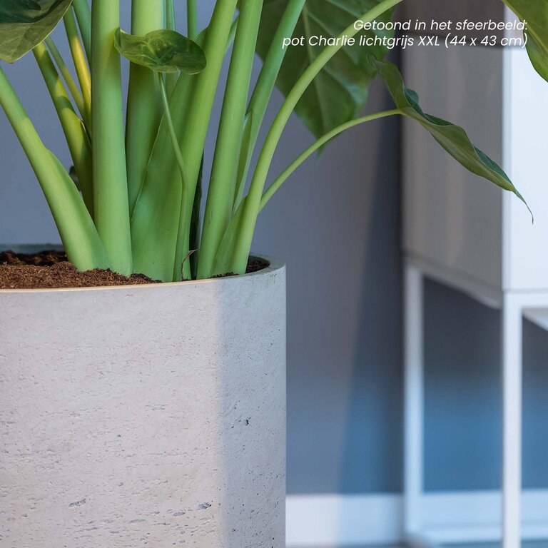 Pot Charlie in de kleur lichtgrijs is een plantenpot gemaakt van fiberclay, een mengsel van cement versterkt met glasvezels. Door het strakke design en de natuurlijke afwerking heeft de pot een moderne en stoere uitstraling. Doordat de potten vervaardigd zijn uit fiberclay, zijn ze bijzonder sterk en toch relatief licht van gewicht. De potten kunnen zowel binnen als buiten geplaatst worden en zijn uv- en vorstbestendig.