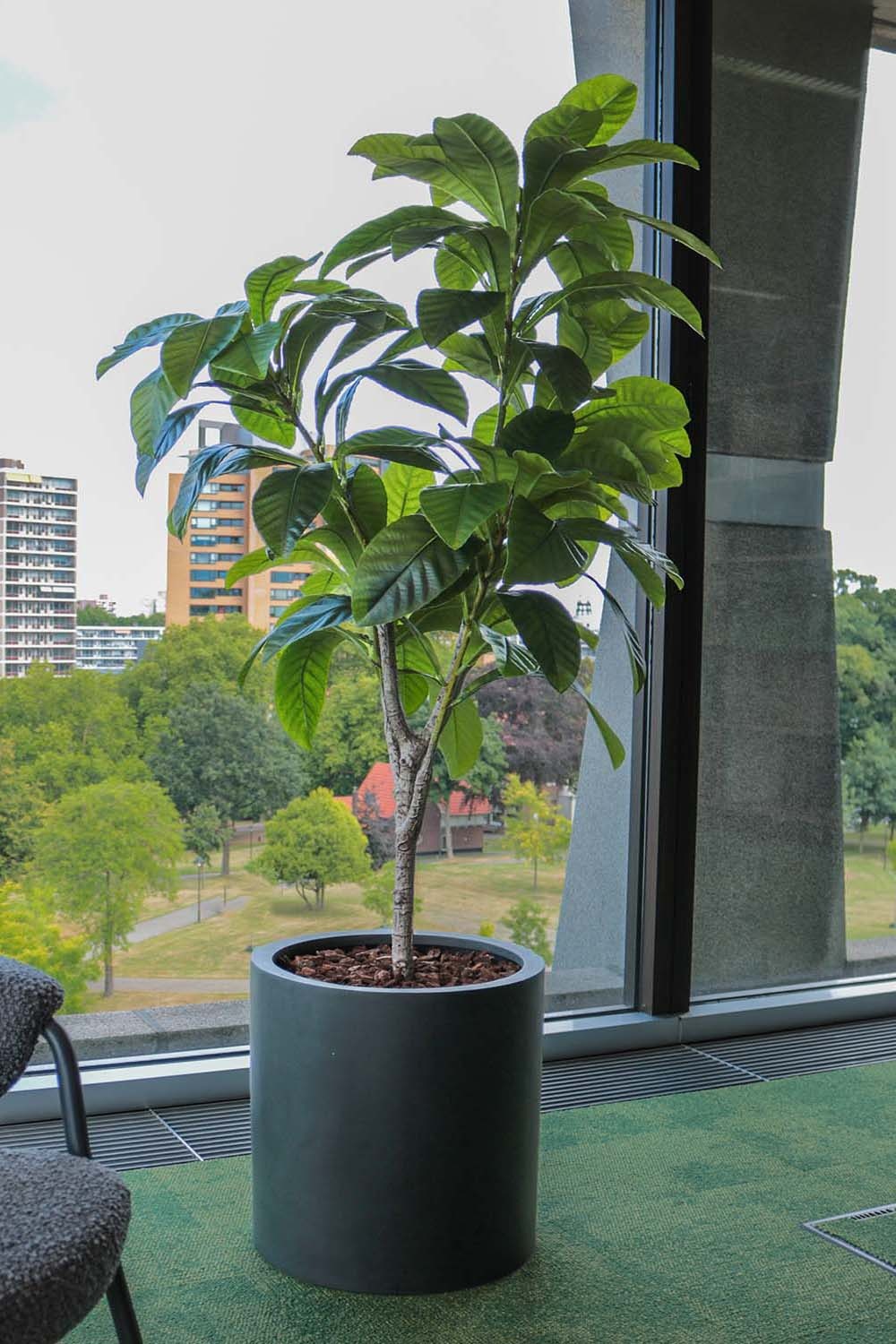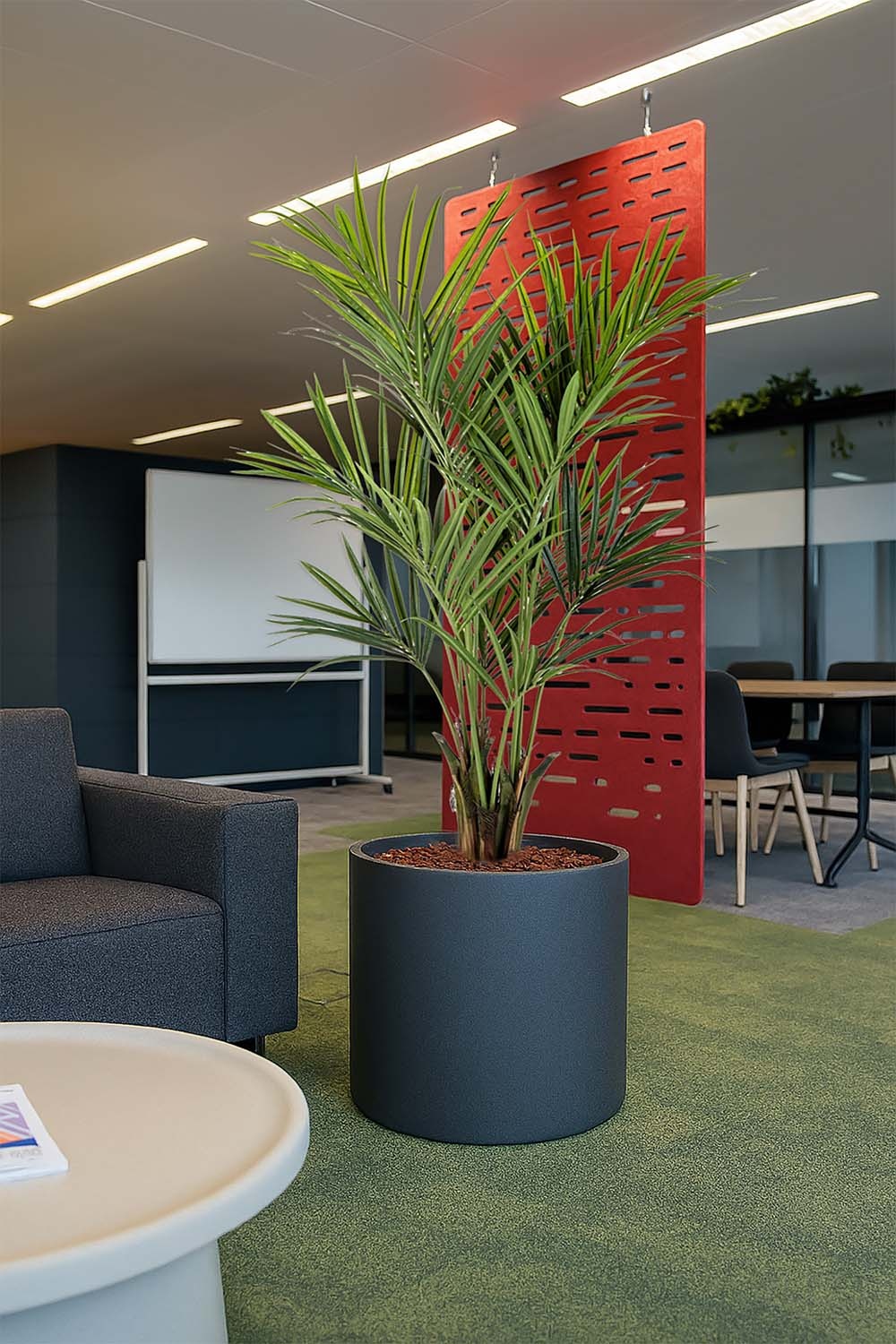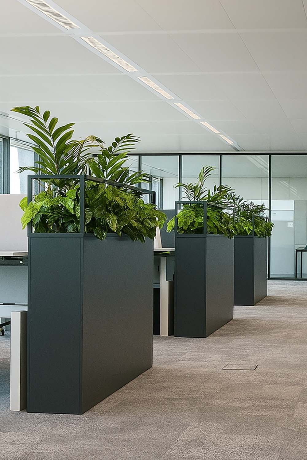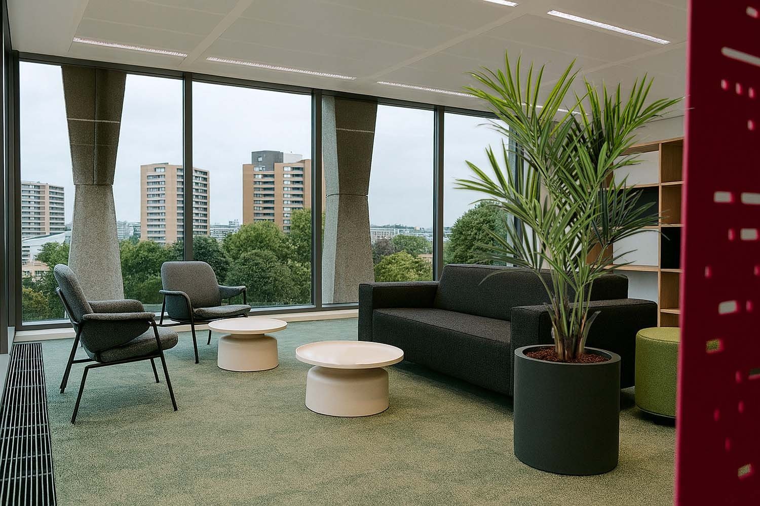 In samenwerking met Base21 realiseerden we een eigentijds beplantingsconcept dat perfect aansluit bij het moderne interieur. De plantenbakken werden gevuld met een speelse, lage begroeiing van Zamioculcas, Ficus Lyrata, Ficus Elastica en Calathea kunstplanten. Daarnaast kregen de metalen dividerkasten een groene invulling met Graslelie en Cordyline, wat zorgt voor een subtiele scheiding tussen werkzones. Boven de vergadertafel zorgen hangende Tradescantia hangplanten voor een luchtige, natuurlijke sfeer. In de zithoek maken drie grote fiberstone potten met Frangipani, Strelitzia en Kentia-palm de ruimte helemaal af, echte blikvangers die warmte en rust brengen.