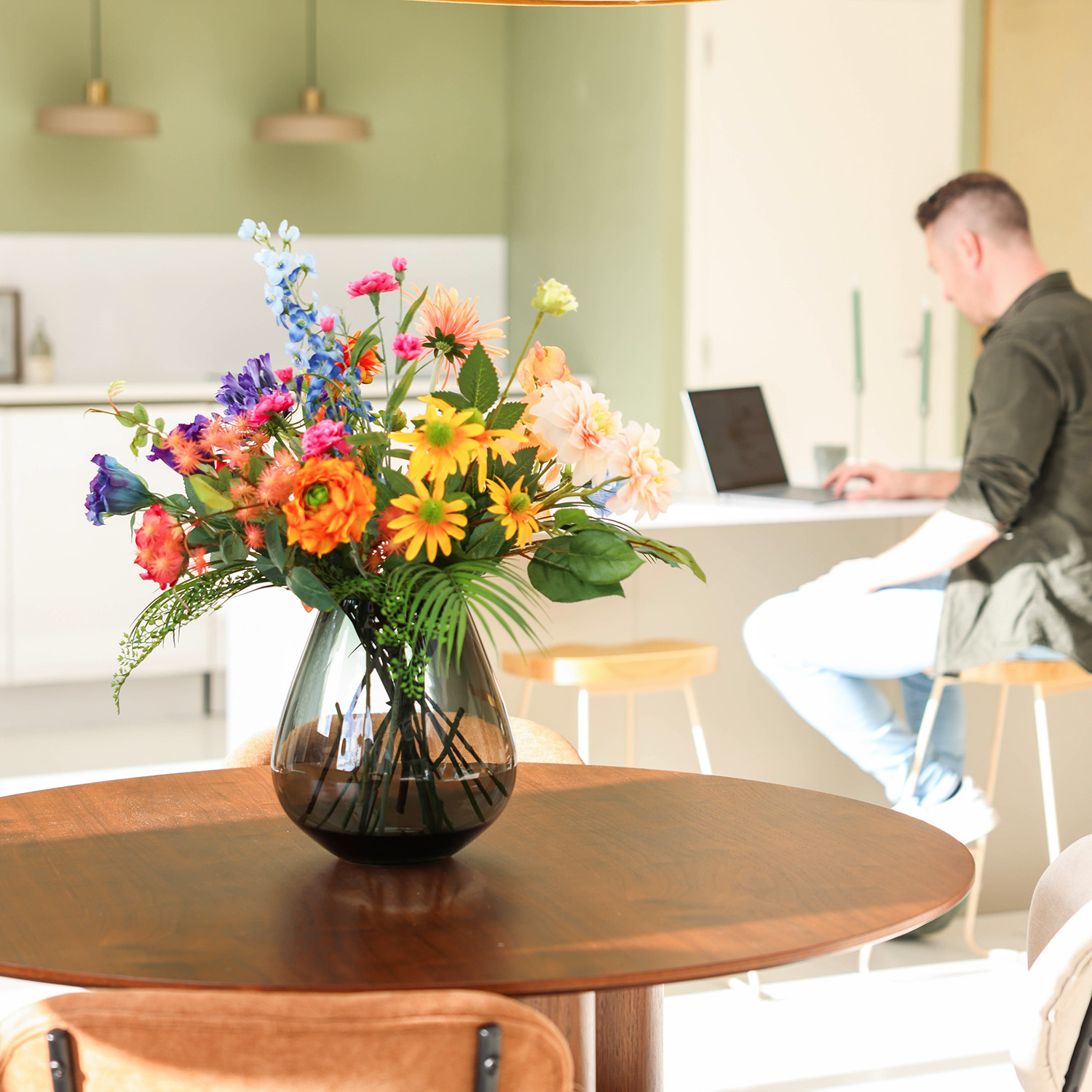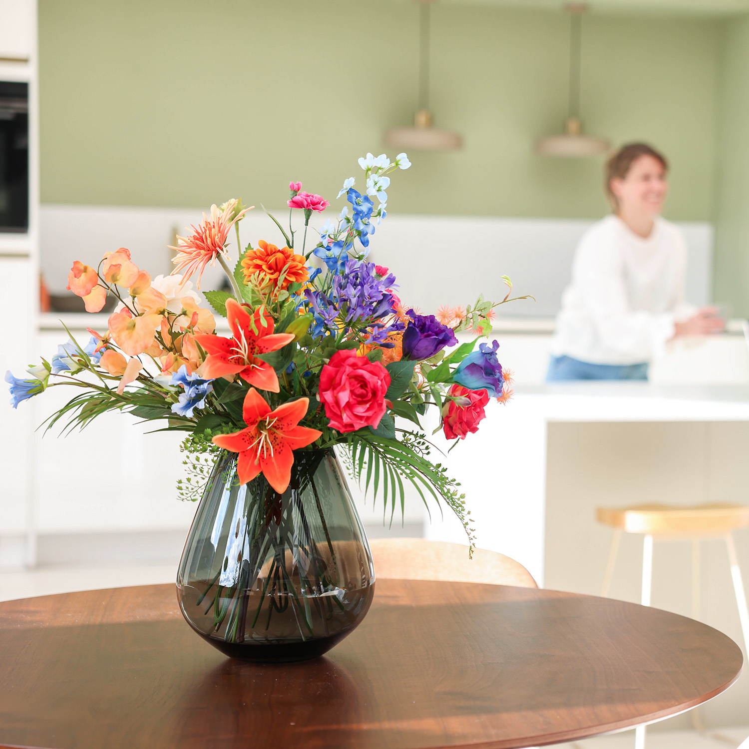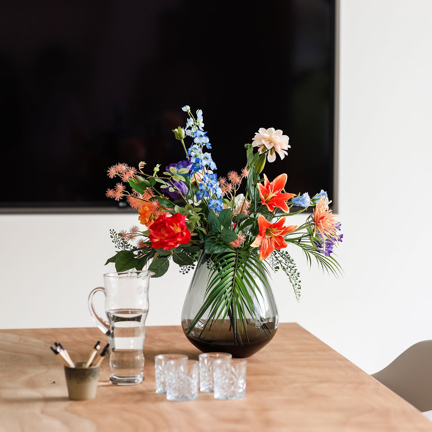 Zeer mooi boeket en mooi, snel thuisgeleverd. Zeer tevreden van mijn Zijden boeket Dixie Dawn en Glazen vaas Tasman antraciet (26 x 28 cm), zeer stijl... Lees meer